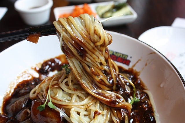 QQ的麵條沾上黑黑的炸醬,真的好吃